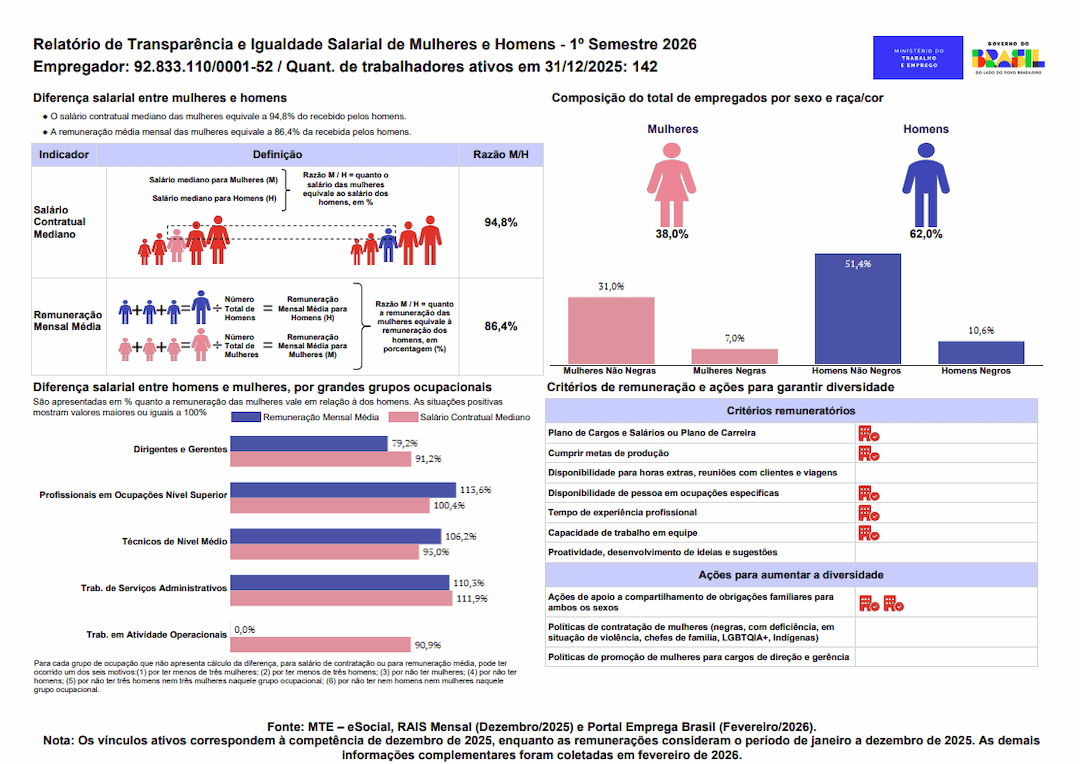 A Aeromot segue comprometida com a transparência e a equidade salarial. Em conformidade com a Lei nº 14.611/2023 e o Decreto nº 11.795/2023, estamos publicando o novo Relatório de Transparência Salarial, referente ao 1º semestre de 2026, elaborado pelo Ministério do Trabalho e Emprego.